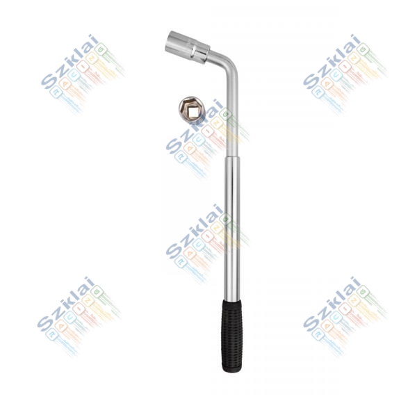 KERÉKKULCS teleszkópos. A fordítható, cserélhető fejek 17-19, illetve 21-23 mm-es kerékcsavarokhoz alkalmasak. A teleszkópos kar maximum 530 mm-ig nyitható. Anyaga: acél, króm-vanádium, gumi markolattal.