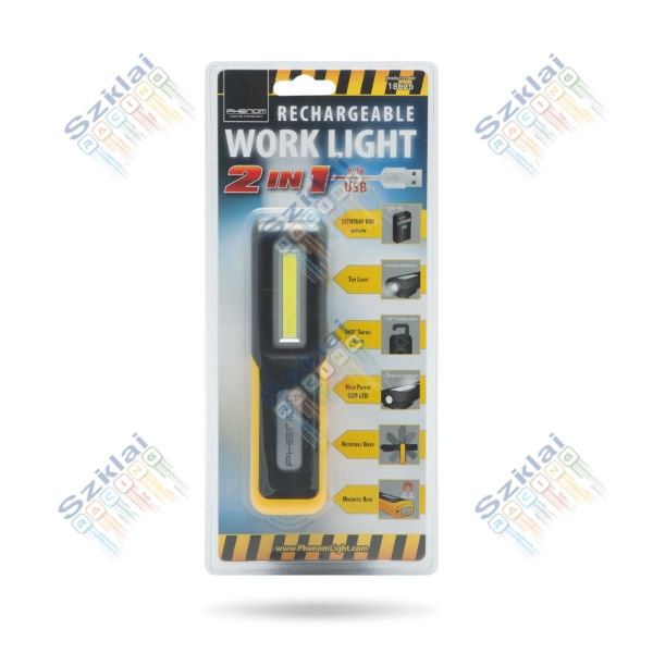Kisméretű, mégis nagy fényerővel rendelkező munkalámpa. Nem hiányozhat egyetlen garázsból, műhelyből sem. A COB LED technológia bevilágítja a kivánt munkaterületet, praktikus 360°-os akasztójának, forgatható lámpatestjének, és mágneses rögzíthetőségének köszönhetően könnyen rögzítheti úgy, ahogyan éppen szüksége van fényforrásra. Kettő az egyben lámpa, a tetején LED-es zseblámpafunkcióval, az oldalán a COB LED munkalámpával. Bárhová magával viheti, könnyű súlyának és övcsipeszének köszönhetően. Beépített Li-ion akkumulátora környezetbarát eszközzé teszi, amely hosszantartó fényerővel is rendelkezik.